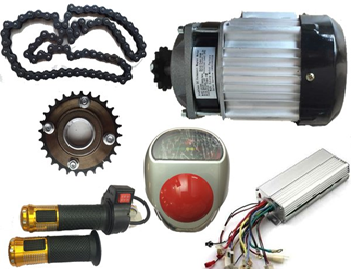 48 volt 850 watt electric vehicle kit.48 volt 850 watt traction BLDC motor with reduction gearbox 1:6 Controller with all features. Throttler with horn switch and 2 meter wire. Main wiring set, Battery wiring set Led head light with battery level indication , key switch and horn. One way clutch gear 28 teath 72 link chain Charger 5 Amp